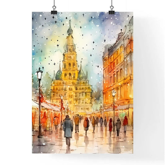 A Poster of people walking a beautiful Italian Christmas market - A Watercolor Painting Of A Street With Buildings And People Walking