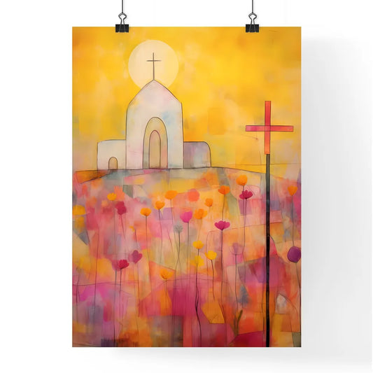 A Poster of the easter church painting - A Painting Of A Church And A Cross In A Field Of Flowers