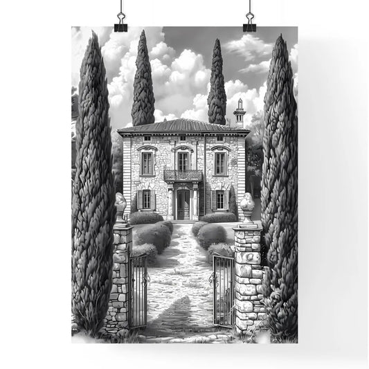 A French Chateau winery - Art print of a drawing of a house with trees and a gate