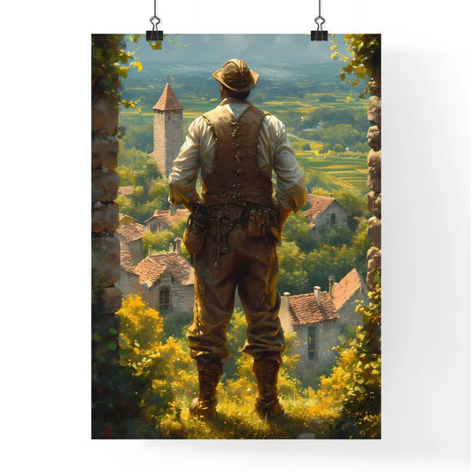 A French vineyard owner - Art print of a man standing on a ledge looking at a village