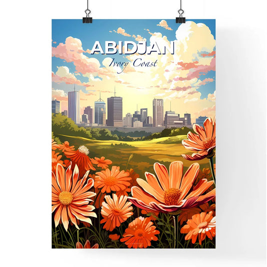 Abidjan Ivory Coast Skyline - Vibrant Painting of Cityscape with Orange Floral Field in the Foreground