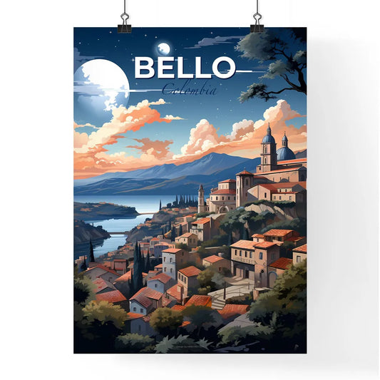 Abstract Landscape Painting of Colorful Town by River and Mountains, Bello Colombia Skyline Art