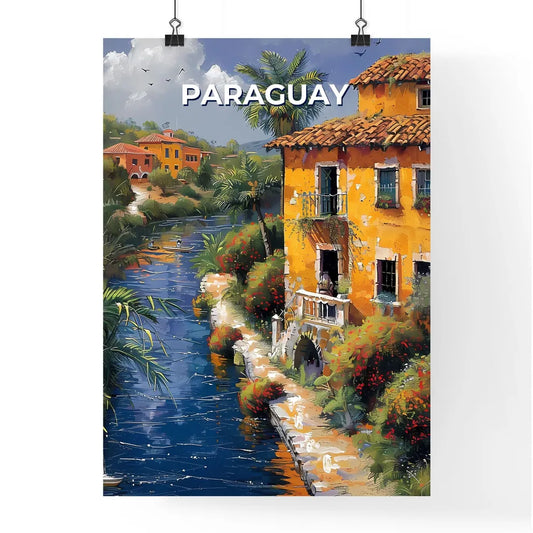 Abstract Painting: Vibrant South American Art of Colorful Building by River in Paraguay