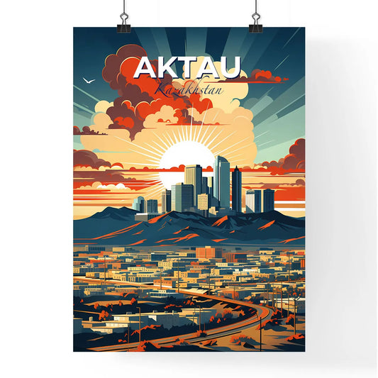 Aktau, Kazakhstan, A Poster of a city with mountains and clouds in the sky