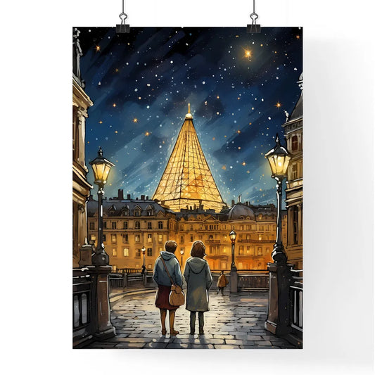 A Poster of adorable christmas illustration card - A Couple Of People Walking In A Courtyard With A Large Pyramid In The Background