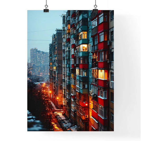A Poster of a straight facade of a big aparment block building - A Building With Many Windows And Lights