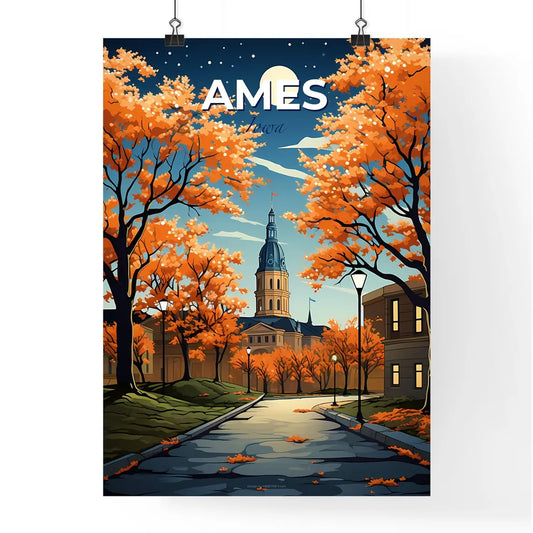 Ames, Iowa, A Poster of a road with orange trees and a building in the background