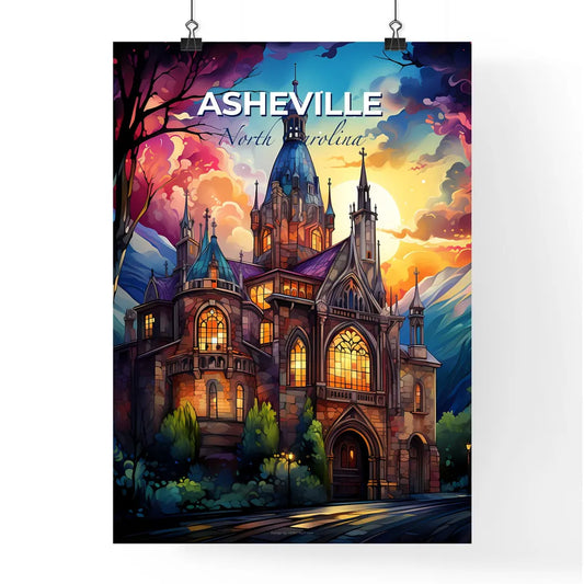 Asheville, North Carolina, A Poster of a painting of a castle with a colorful sky and trees