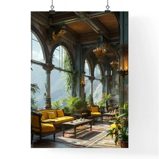 A Poster of furniture on deck with a view - A Room With A Large Window And Plants