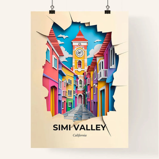Vivid Simi Valley, California - a clock tower is seen through a hole in a paper cutout