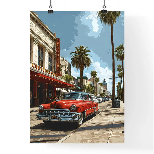 A Poster of Hollywood California Skyline - A Red Car Parked On A Street