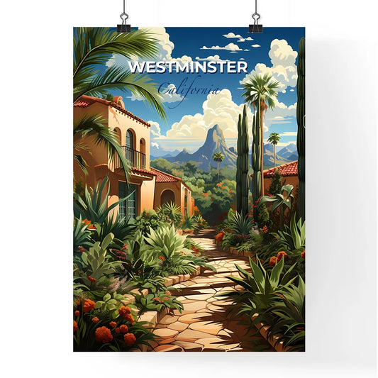Westminster, California, A Poster of a stone path between buildings with plants and trees