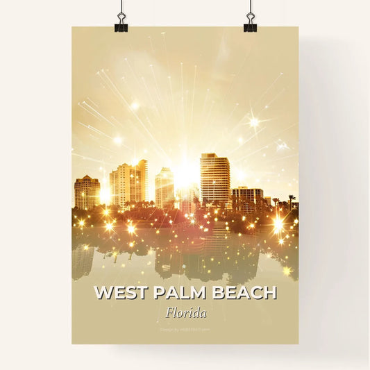 West Palm Beach Cityscape Skyline Sunset Reflection - A city skyline with lights and a beach
