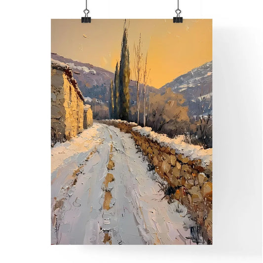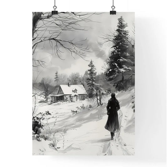 Winter Landscape Painting with Old House, Trees and Snow Scene Person Walking