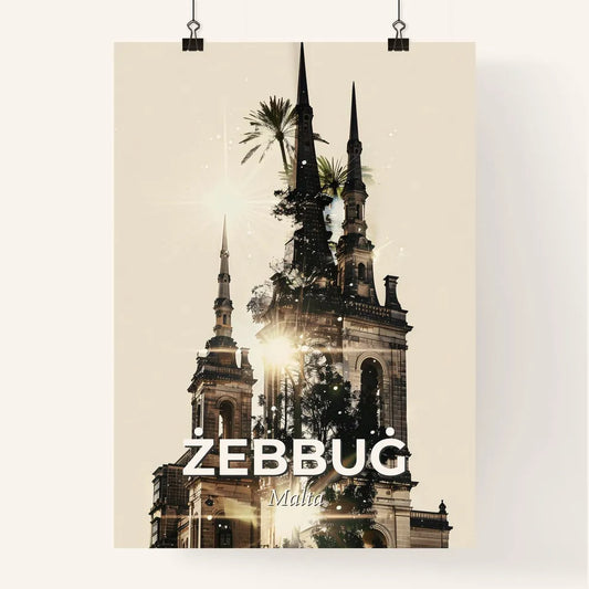 Zebbug, Malta: City Skyline and Icons Double Exposure Poster - A tall building with trees and a light shining on it