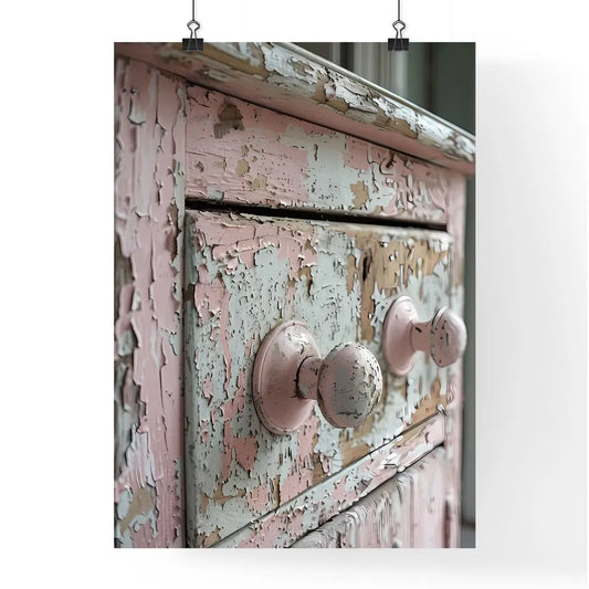 Vintage Inspired Shabby Chic Bathroom Cabinet with Painted Details, Distressed Materials and Neutral Tones, Close-Up of Dresser with Vibrant Painting, Minimalistic Composition, Soft Lighting