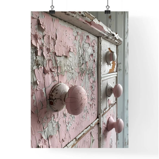 Closeup shabby chic wooden kitchen cabinets pink peeling paint neutral tones vibrant painting kitchen decor