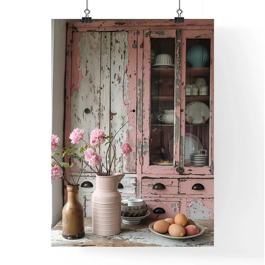 Shabby Chic Painted Pink Kitchen Cabinets with Light Brown Peeling Paint, Neutral Tones, Vibrant Painting, Pink Vase, Flowers, Eggs, Realistic Photography