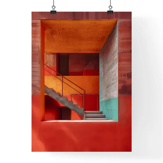 Minimalist Brutalist Architecture Staircase Leading to Vibrant Red Wall with Art Focus