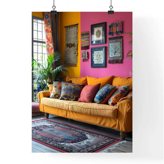 Colorful Bangladeshi Boho Art Painting: Couch with Pillows in Vibrant Pink Room with Rug