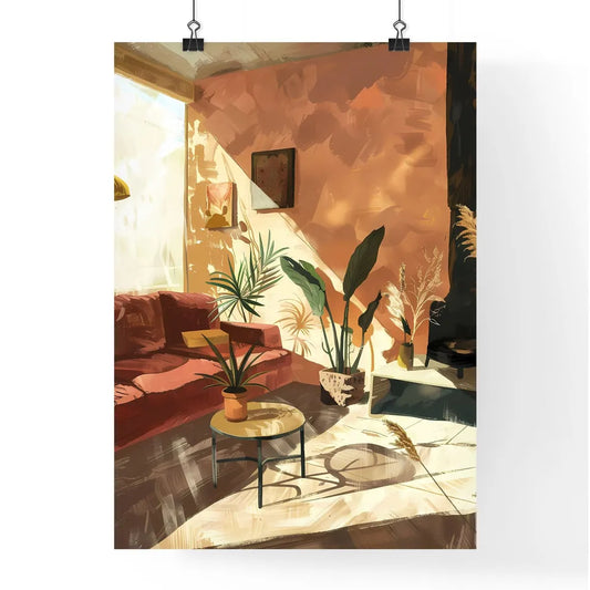 Modern Living Room Art: Vibrant Painting, Teal Couch, Green Plants, Home Decor
