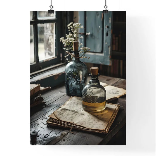 Charcoal, honey, clear bottles filled with liquids, ochre, and faded colors of ancient watercolor painting on a table
