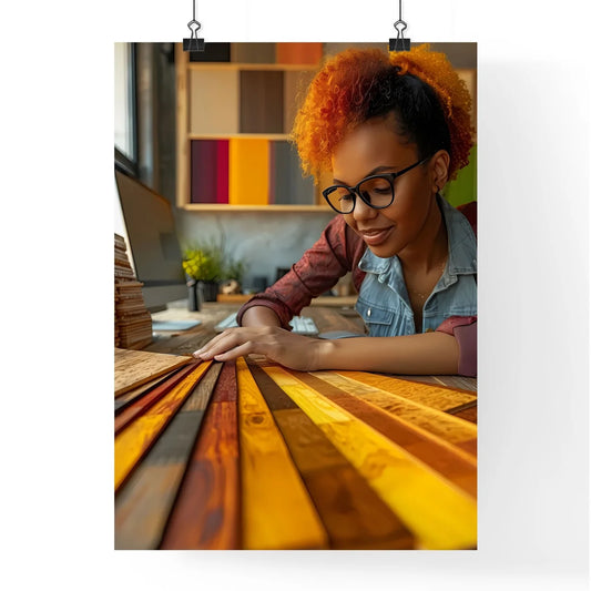 Female interior designer selecting wood samples, warm light, choosing paint colors, vibrant painting, computer, art