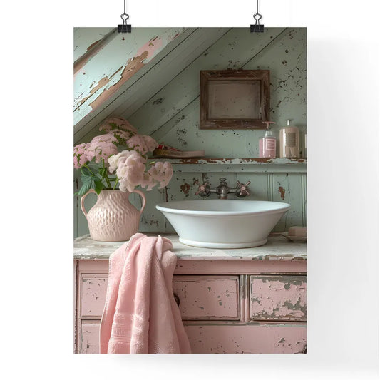 Minimalistic, soft lighting, neutral tones, pale pink, vintage, shabby chic, bathroom, cabinet, drawer, painting, art, vibrant colors, distressed materials, light beige, ivory details