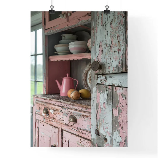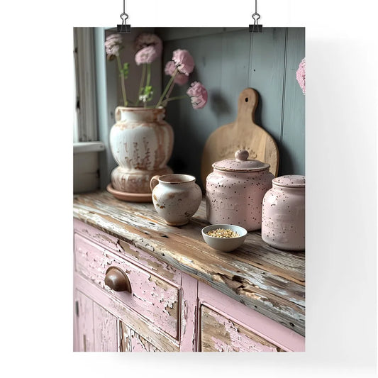 Shabby Chic Pink Kitchen Cupboards Brown Peeling Paint Neutral Tones Counter Vases Bowls Painting Art
