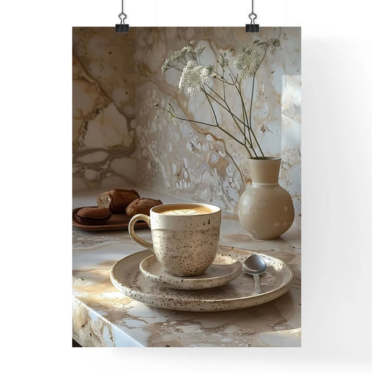 Neo-concrete still life with coffee cup, vase, and flowers, hyper-realistic water, provia film, light brown and white, drugcore, painting