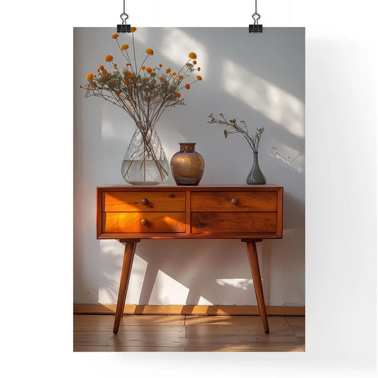 Tabletop Art: Mid-Century Minimalism, Vibrant Painting, Vintage Vases, Timeless Nostalgia, Wood, Whimsical, Light Brown, Dark Amber