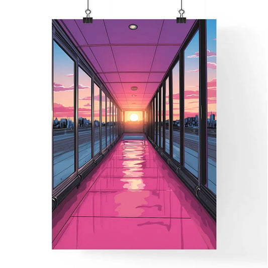 Pack your bags with adaptability today - Art print of a long hallway with a pink floor and glass windows