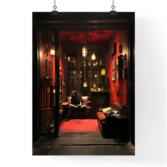 A Poster of person a new kind of woman - A Woman Sitting On A Couch In A Room With Red Walls