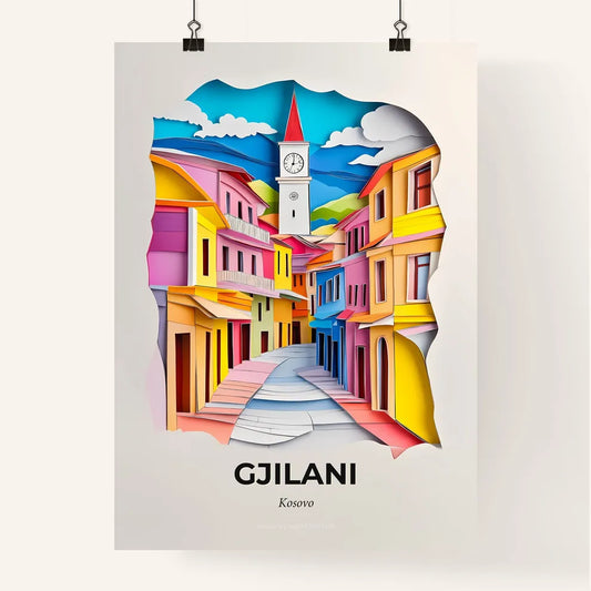 Vivid Gjilani / Gnjilane, Kosovo - a paper cut of a colorful city with a clock tower