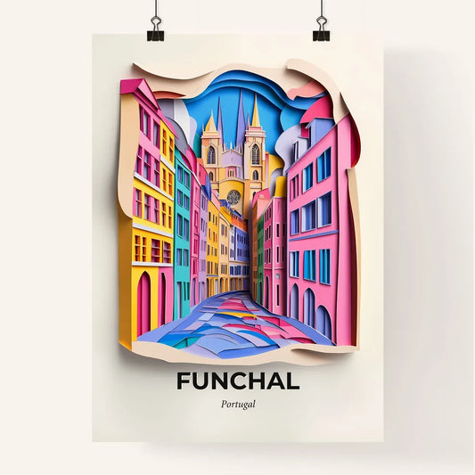 Vivid Funchal, Portugal - a paper cut of a city street with a clock tower