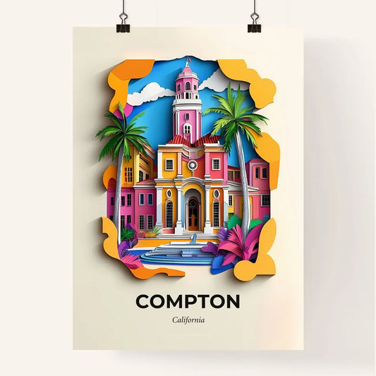 Vivid Compton, California - a paper cut of a city with a clock tower