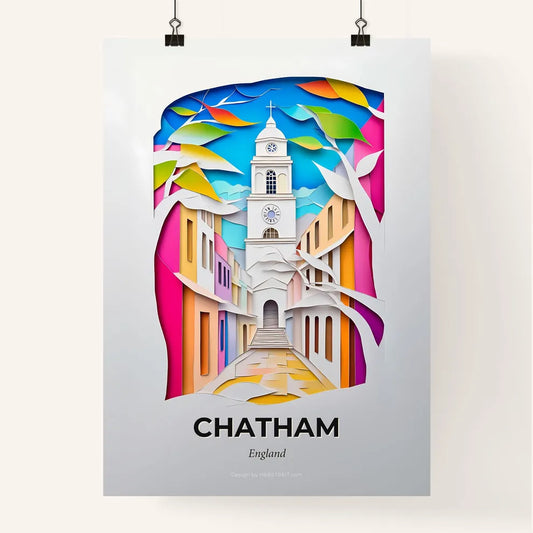 Vivid Chatham, England - a paper cut of a church tower with a clock