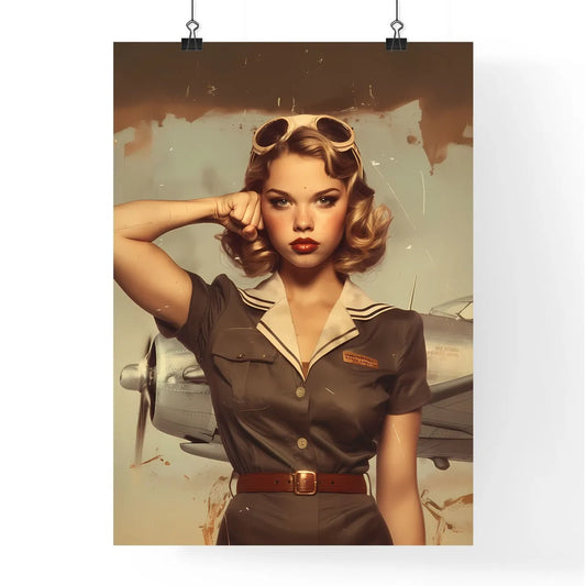 You can do it woman, vintage artwork, flexing bicep, wearing flight attendant uniform, making a serious face - Art print of a woman in uniform with goggles on her head