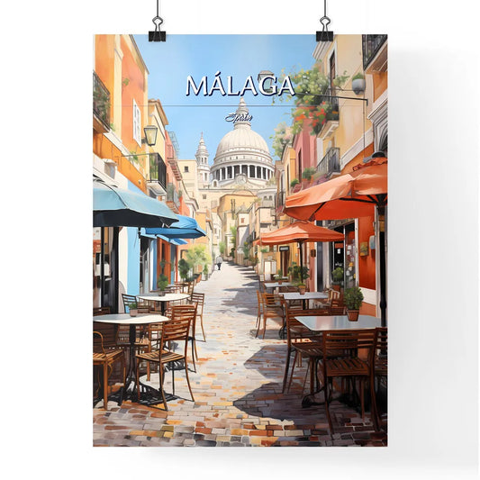 Málaga, Spain - Art print of a street with tables and chairs and umbrellas