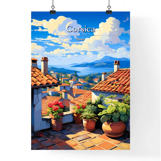 On the roofs of Corsica, France - Art print of a rooftop of a town with potted plants and a view of the water