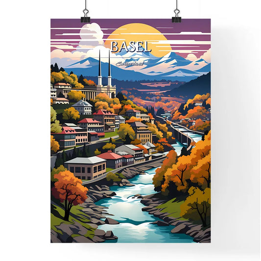 Basel, Switzerland - Art print of a colorful landscape of a town with a river and mountains