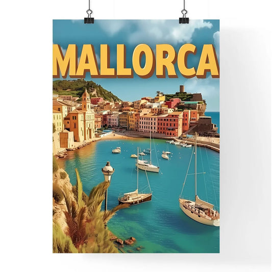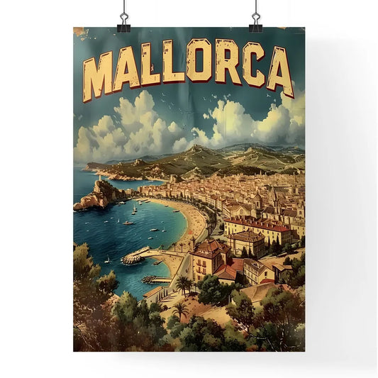Mallorca spain poster with text MALLORCA in a beautiful matching font - Art print of a poster of a town on the water