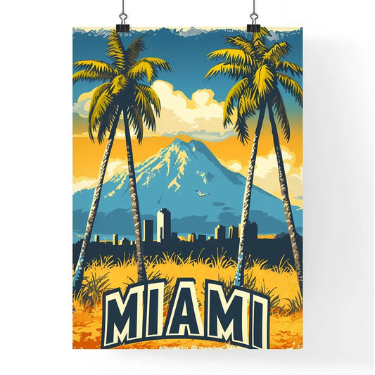 Poster with bottom text MIAMI in bold font - Art print of a poster of a beach with palm trees and a mountain in the background