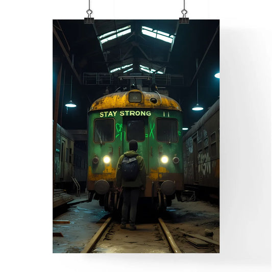 A new york train with the words spray painted STAY STRONG on it in eletric lime green, vintage poster design - Art print of a man standing in front of a train