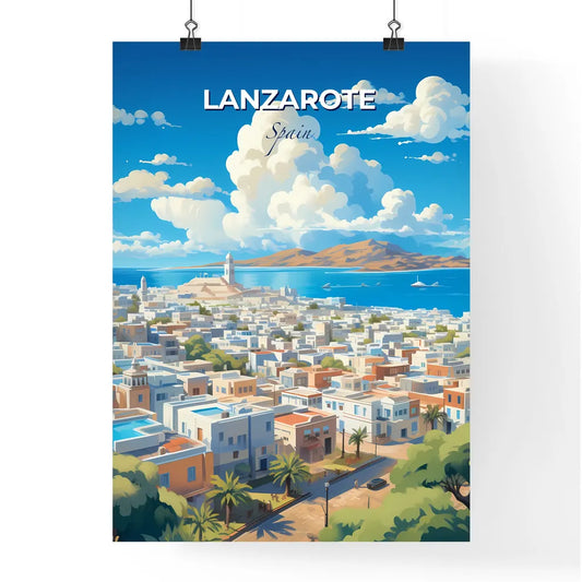 Lanzarote Spain Skyline - A City With A Body Of Water And A White Tower - Customizable Travel Gift
