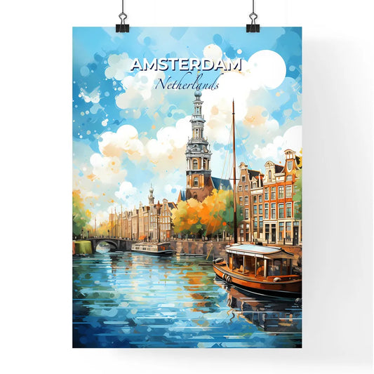Amsterdam Netherlands Skyline - A Water Canal With Boats And A Tower - Customizable Travel Gift
