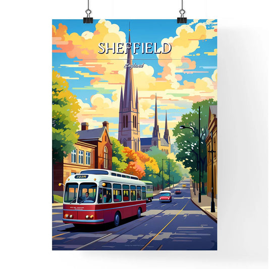 Sheffield, England - Art print of a bus driving down a street with buildings and trees