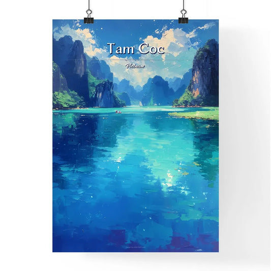 Tam Coc, Vietnam - Art print of a painting of a body of water with mountains and blue sky