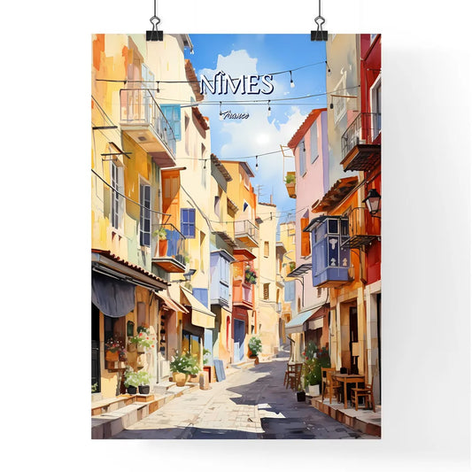 Nîmes, France - Art print of a street with tables and umbrellas in a city