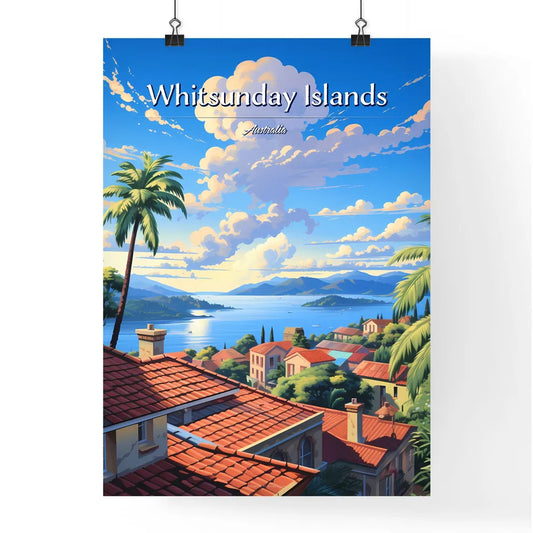 On the roofs of Whitsunday Islands, Australia - Art print of a view of a town with a body of water and mountains